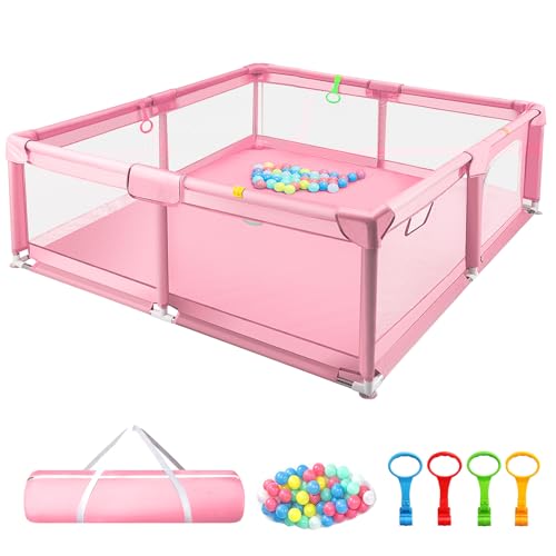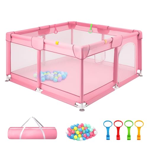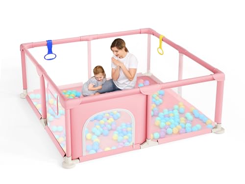 Supernic Baby Playpen for Babies and Toddlers with Mesh Walls, Ocean Balls & Pull Rings Included, for Indoor & Outdoor Use, Toddler Fence - Breathable Mesh, Extra Large Play Yard (Pink, 180x150cm)