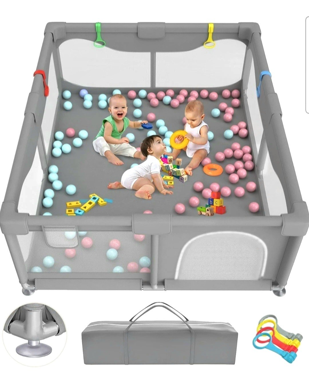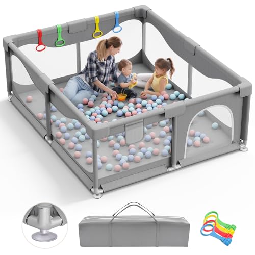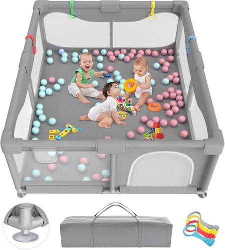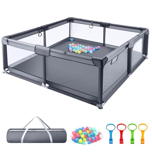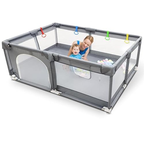 Supernic Baby Playpen for Babies and Toddlers with Mesh Walls, Ocean Balls & Pull Rings Included, for Indoor & Outdoor Use, Toddler Fence - Breathable Mesh, Extra Large Play Yard (Grey, 180x150cm)
