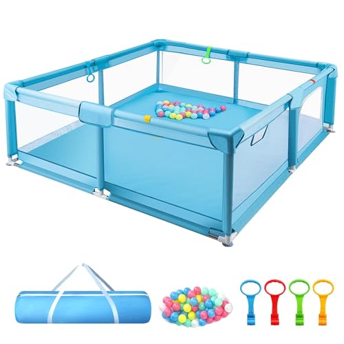 Supernic Baby Playpen for Babies and Toddlers with Mesh Walls, Ocean Balls & Pull Rings Included, for Indoor & Outdoor Use, Toddler Fence - Extra Large Play Yard Breathable Mesh (Blue, 180x150cm)