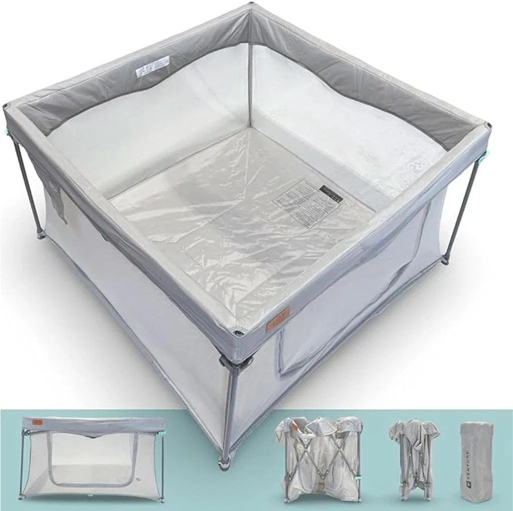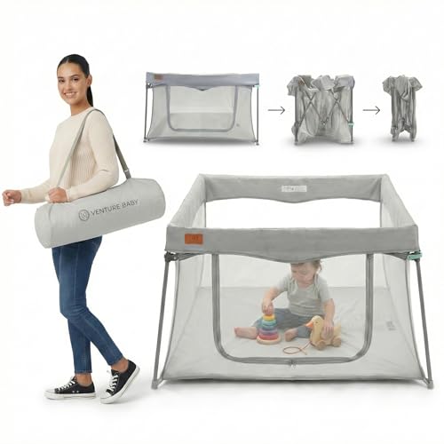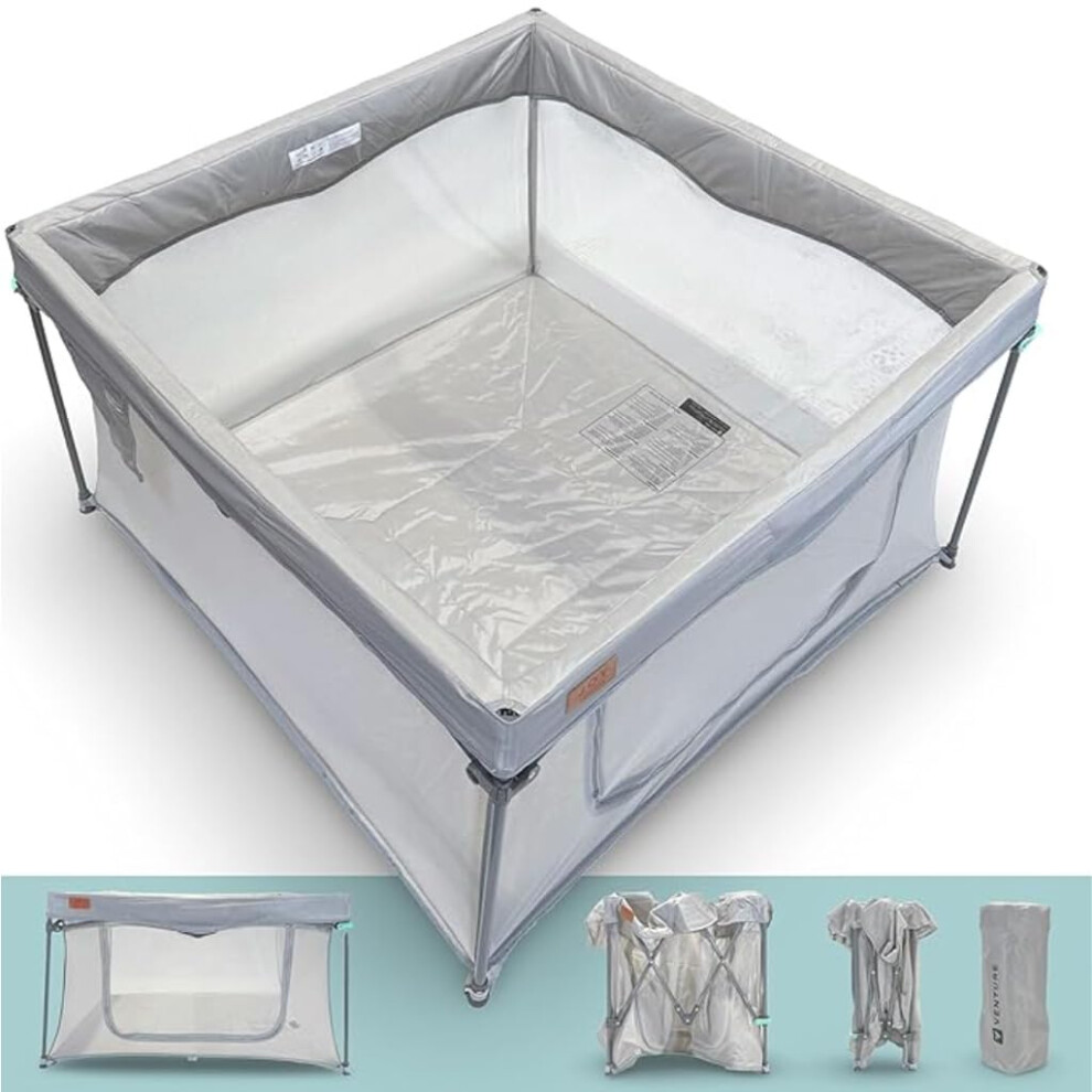 Venture All Stars Joy Square Baby Playpen - Foldable, Compact Playpen for Baby and Toddlers with Mesh Sides, Fitted Mat, and Zipper Door - Portable Play Pen with Travel Bag (6-36 Months)