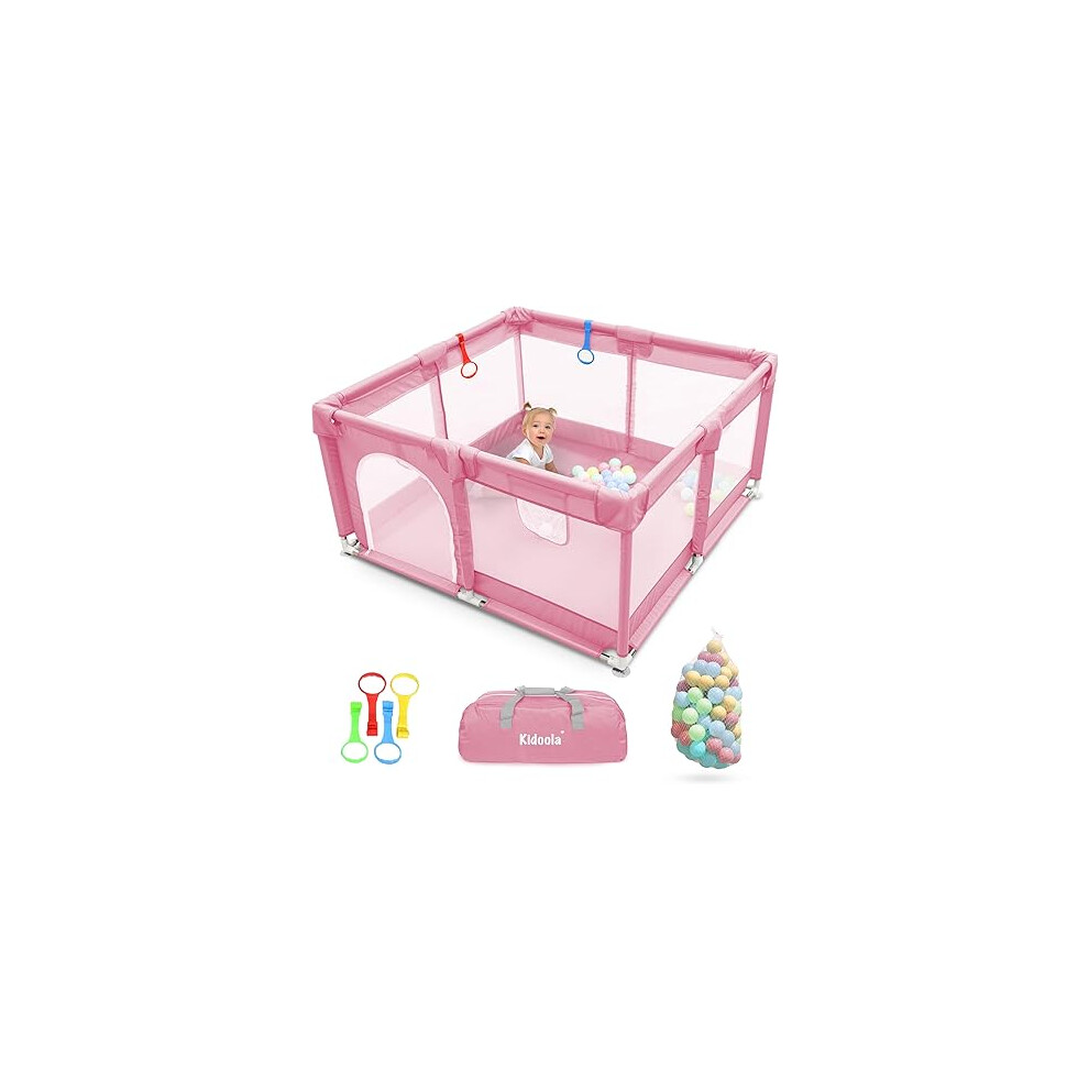 (Pink) Kidoola Baby Playpen with Padded Frame & Mesh Walls, Baby Play Pen with Balls, Pull Rings, Playpen for Baby and Toddlers, 127x127x65cm