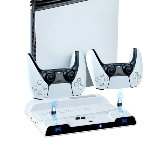 Mcbazel PS5 Cooling Stand with Dual Controller Charging Station, Multifunctional Vertical Stand for Playstation 5/Slim/Pro Consoles, Includes 4 Type-C Adapters, USB Cable, and Headset Holder, White