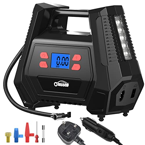 Oasser Tyre Inflator Air Compressor with 12V AC/240V DC car tyre Pump 150 PSI Mains Car Tyre Pump with Plug with 5 Nozzle Adaptors, LED Light Fits for Cars Motorcycles Bicycles