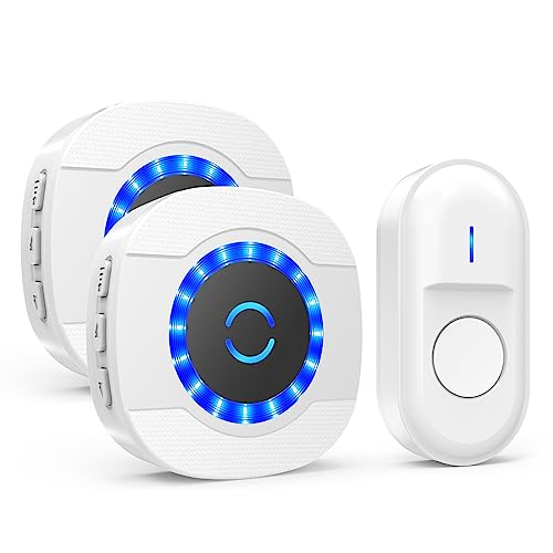 Wireless Doorbell, Waterproof Wall Door Entry Bell Cordless Door Chime Kit with 2 Plug-in Receivers at 1,000feet / 300m Range, 55 Chimes, 5-Level Volume, LED Light (White)