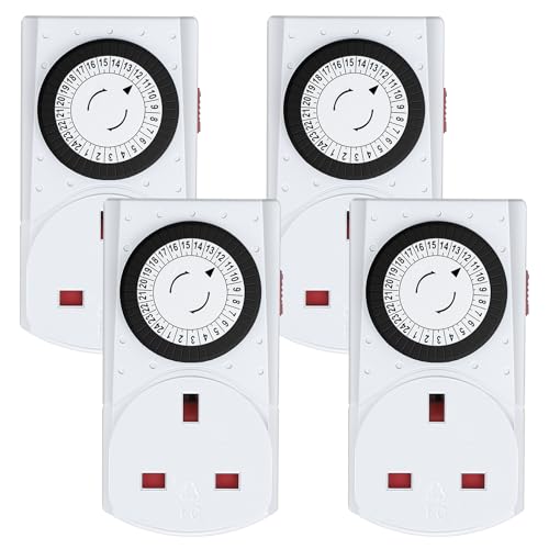 G-Homa Mechanical Timer Plug Socket UK, 24 Hour Programmable Energy Saving Plug-in Indoor Timer Plug Switch for Lights, Lamps and Home Appliances, Daily On/Off Cycle, CE Listed (4 Pack)