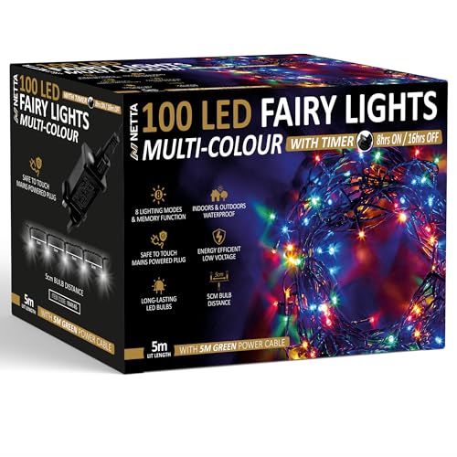 NETTA Christmas Tree Lights 100 LED 5m Fairy String Lights Plug in with Timer and Memory Functions for Outdoor/Indoor Use -Multi Coloured