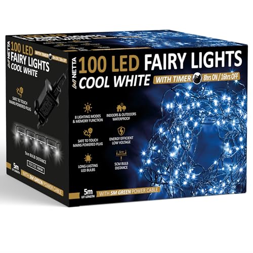 NETTA Christmas Tree Lights 100 LED 5m Fairy String Lights Plug in with Timer and Memory Functions for Outdoor/Indoor Use -Cool White
