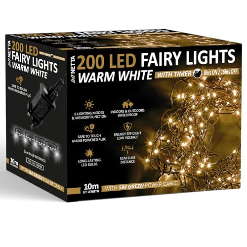 NETTA Christmas Tree Lights 200 LED 10m Fairy String Lights Plug in with Timer and Memory Functions for Outdoor/Indoor Use -Warm White