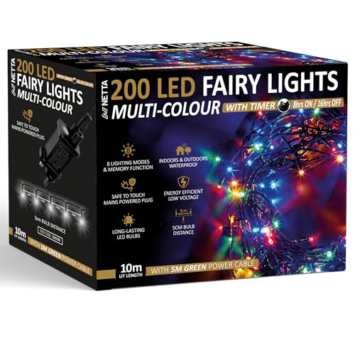 NETTA Christmas Tree Lights 200 LED 10m Fairy String Lights Plug in with Timer and Memory Functions for Outdoor/Indoor Use -Multi Coloured