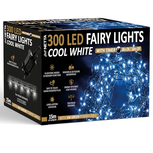 NETTA Christmas Tree Lights 300 LED 15m Fairy String Lights Plug in with Timer and Memory Functions for Outdoor/Indoor Use -Cool White
