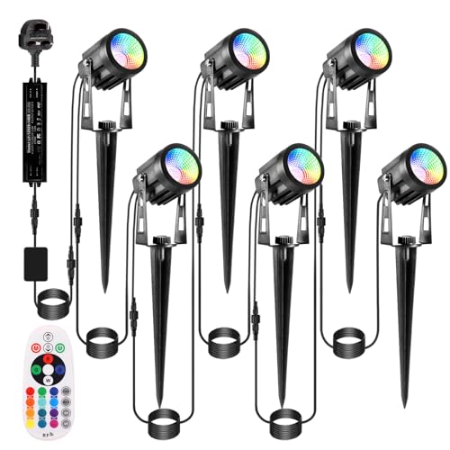 ECOWHO Garden Lights Mains Powered, Outdoor Garden Xmas Spotlights Color Waterproof 20m Extendable Cable IP65 Spike Lights Plug-in Timer Memory Remote for Holiday Decor(18w,12v, Cool White&RGB)