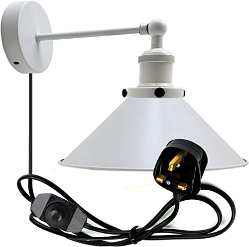 LEDSone Retro Plug in Wall Light Lamps with 2m Plug in Cable Cord and Dimmer Switch, Edison Metal Swing Adjustable E27 Wall Sconce, Vintage Industrial Indoor Reading Bedside Lamp (White)