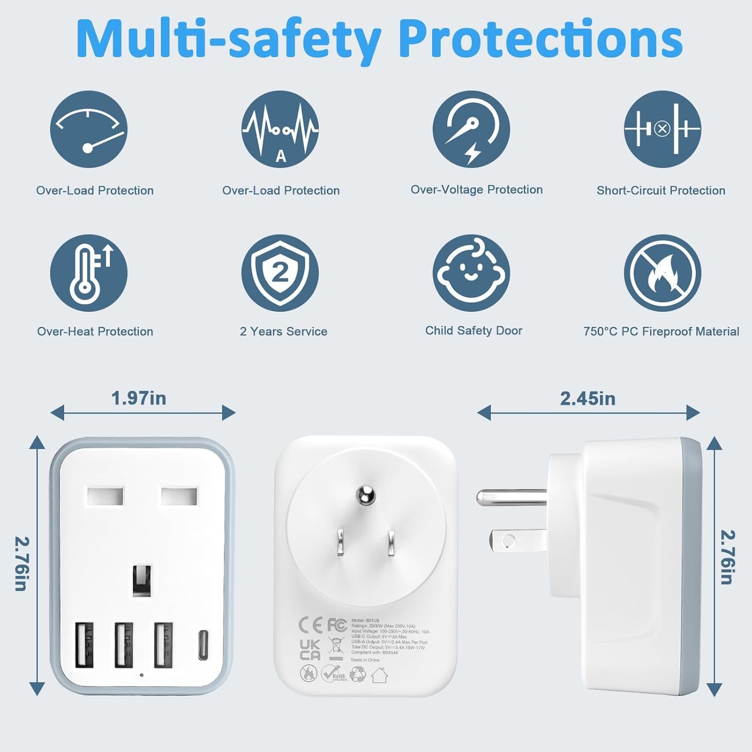 UK to US Plug Adaptor, USA Travel Adapter with 3 USB &1 USB C Ports (17W Fast Ch