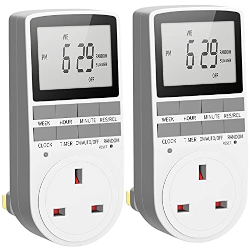 UrbanLuxe 2 Pcs Digital Security Timer Plug Socket with 10 ON-Off Programs, Electrical Timer Plug with LCD Display, Security Random Mode, Suitable for Home Appliances (240V/13A/3120W)