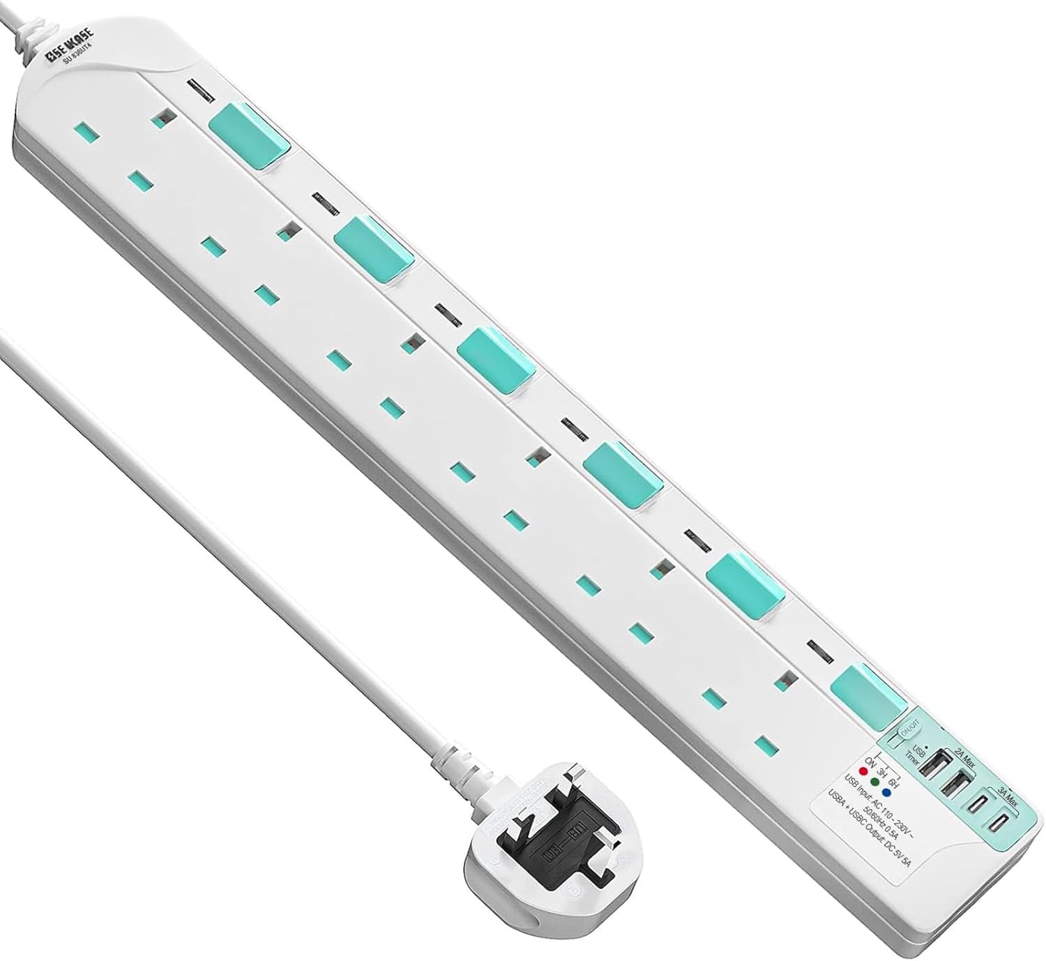 Extension Lead with USB Slots(5V/5A),USB Timer, 6 Way Plug Sockets with Individ