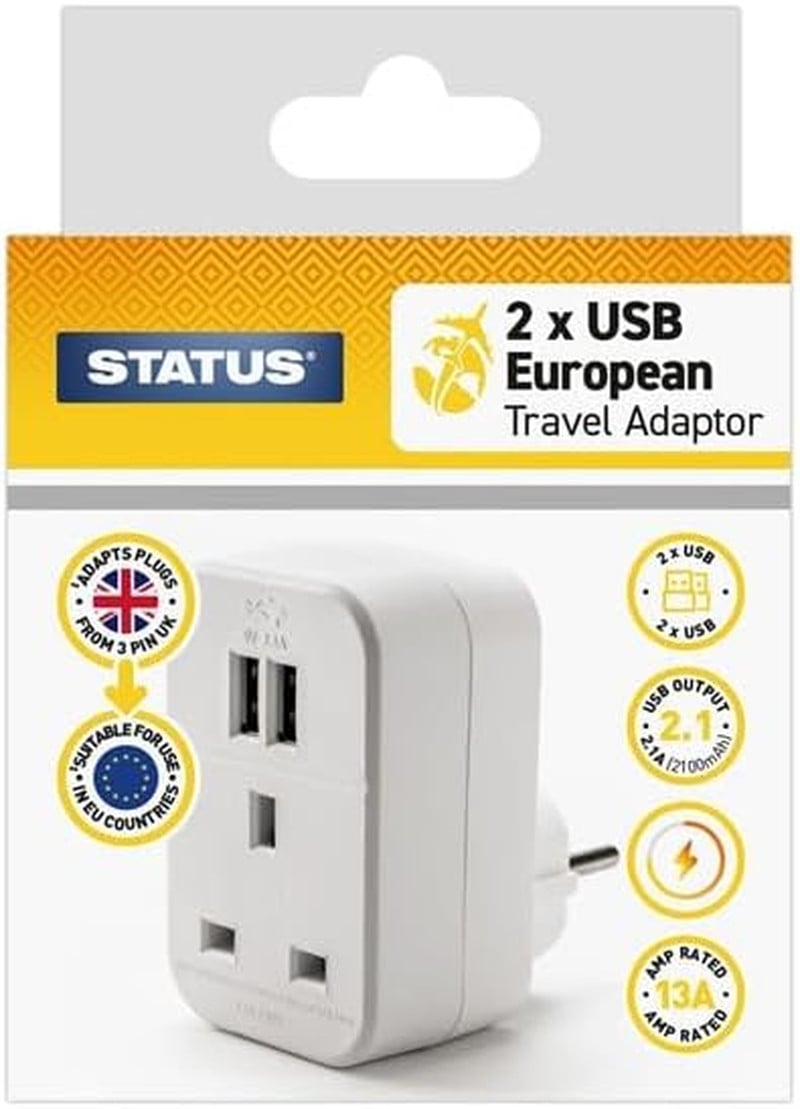STATUS UK to EU European Plug with USB Port Adapter, 3 Pin to 2 Pin European Travel Adaptor, White 2 Port USB Adapter Plug (S2USBTEURO)