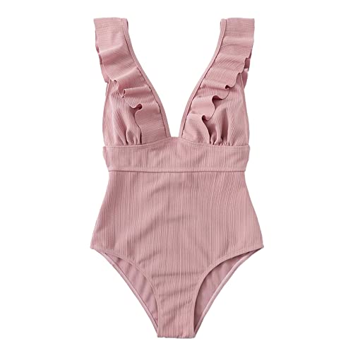 SEDEX Swimming Costume Women One Piece Swimsuits Ladies Plunge V Criss Cross Straps Swimwear Ruffle Monokini Lace Up Beachwear Tummy Control Bathing Suit for Girls(Pink,L)