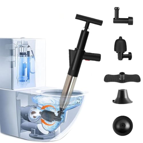 WCIC High Pressure Air Blaster Drain Unblocker Gun & Toilet Plunger Kit with 4 Replaceable Heads - Unblocks Sinks, Toilets, Floor Drains, Shower Pipes & Clogs (Black)