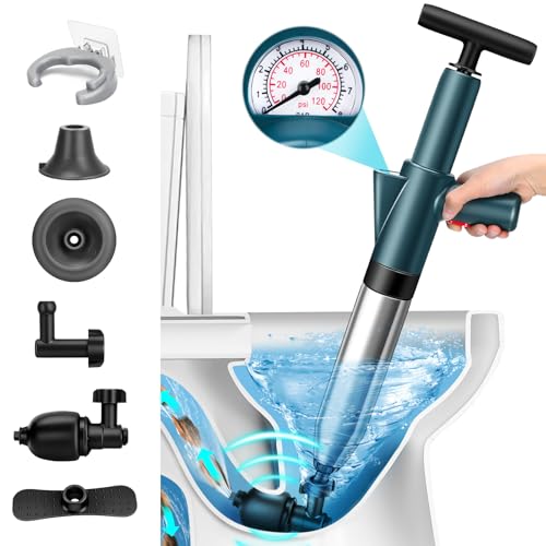 Aolawco Toilet Plunger, Upgraded Toilet Unblocker with Real Time Barometer and 4 Replaceable Heads, Powerful Sink Unblocker High Pressure Plunger Kit with Holder for Bathtub, Drain, Kitchen Clogged