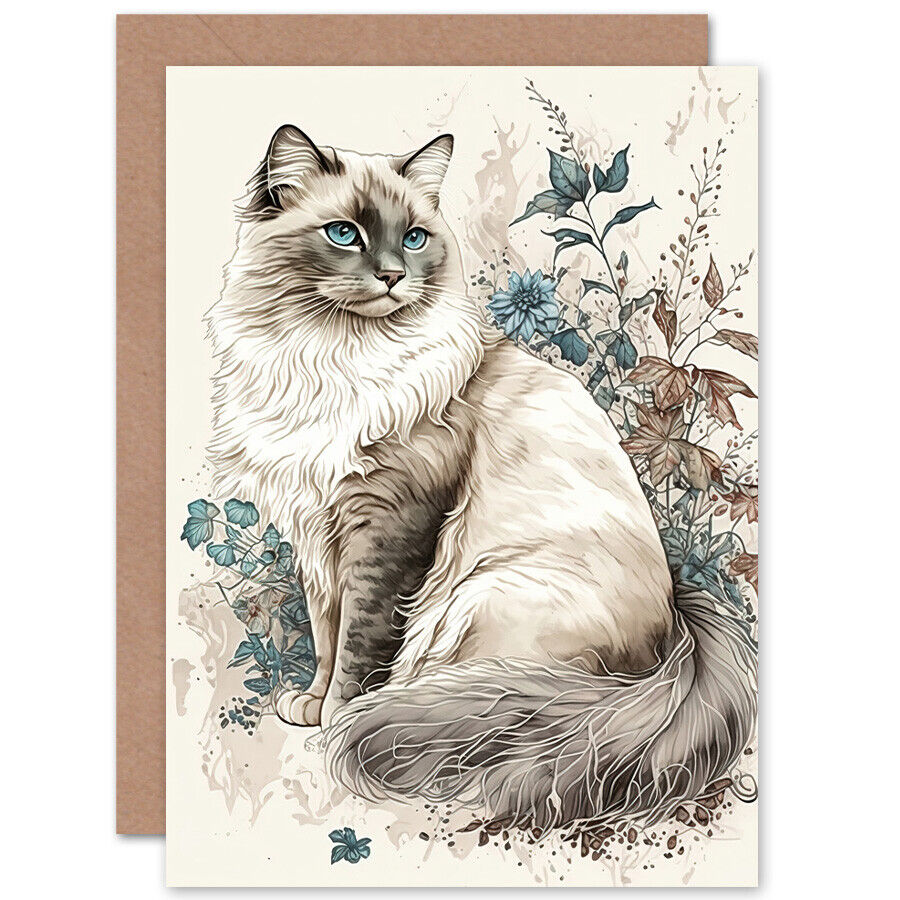 Blue Point Ragdoll Cat Flowers Art Birthday Blank Greeting Card With Envelope