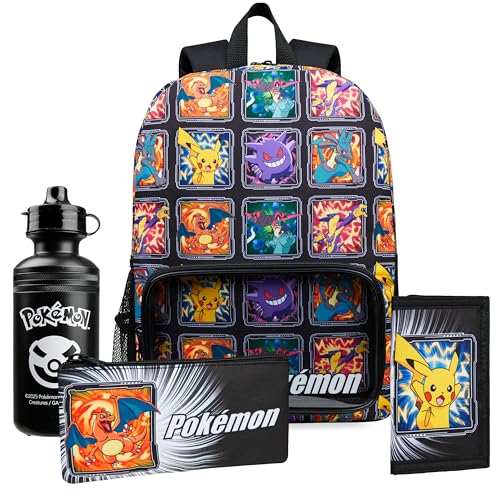 Pokemon Backpack Set 4 Pcs Water Bottle Backpack Pencil Case Insulated Lunch Bag or Wallet Anime School Supplies Travel (Black/Multi 4 Pcs Set)
