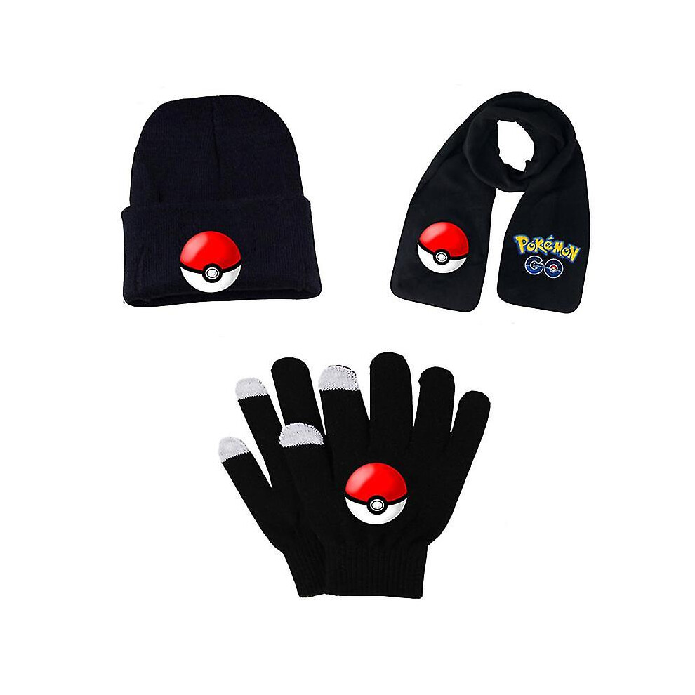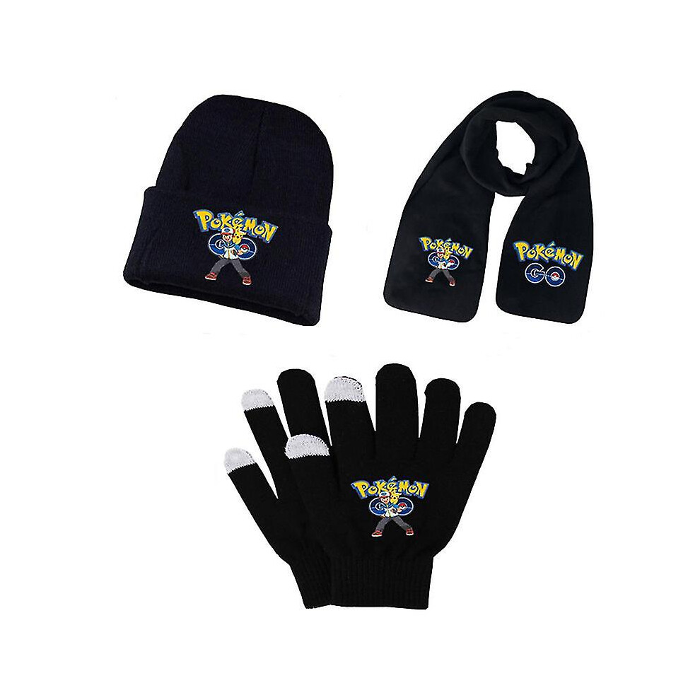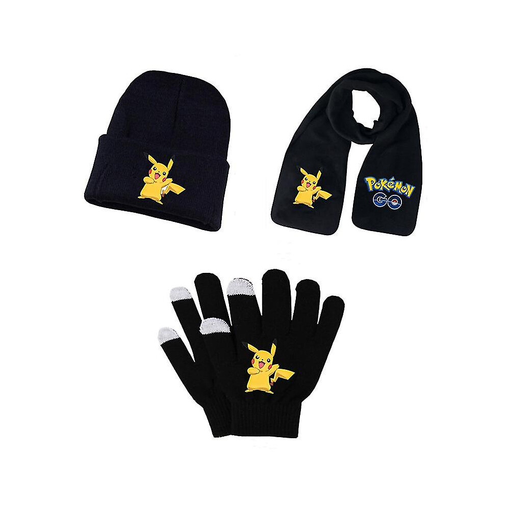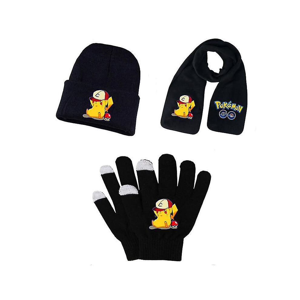 (set 3) Adult Students Autumn Winter Kid Hat Scarf Glove Set Pokemon Pikachu Anime Cartoon Printing Cosplay Touch Screen Riding Gloves