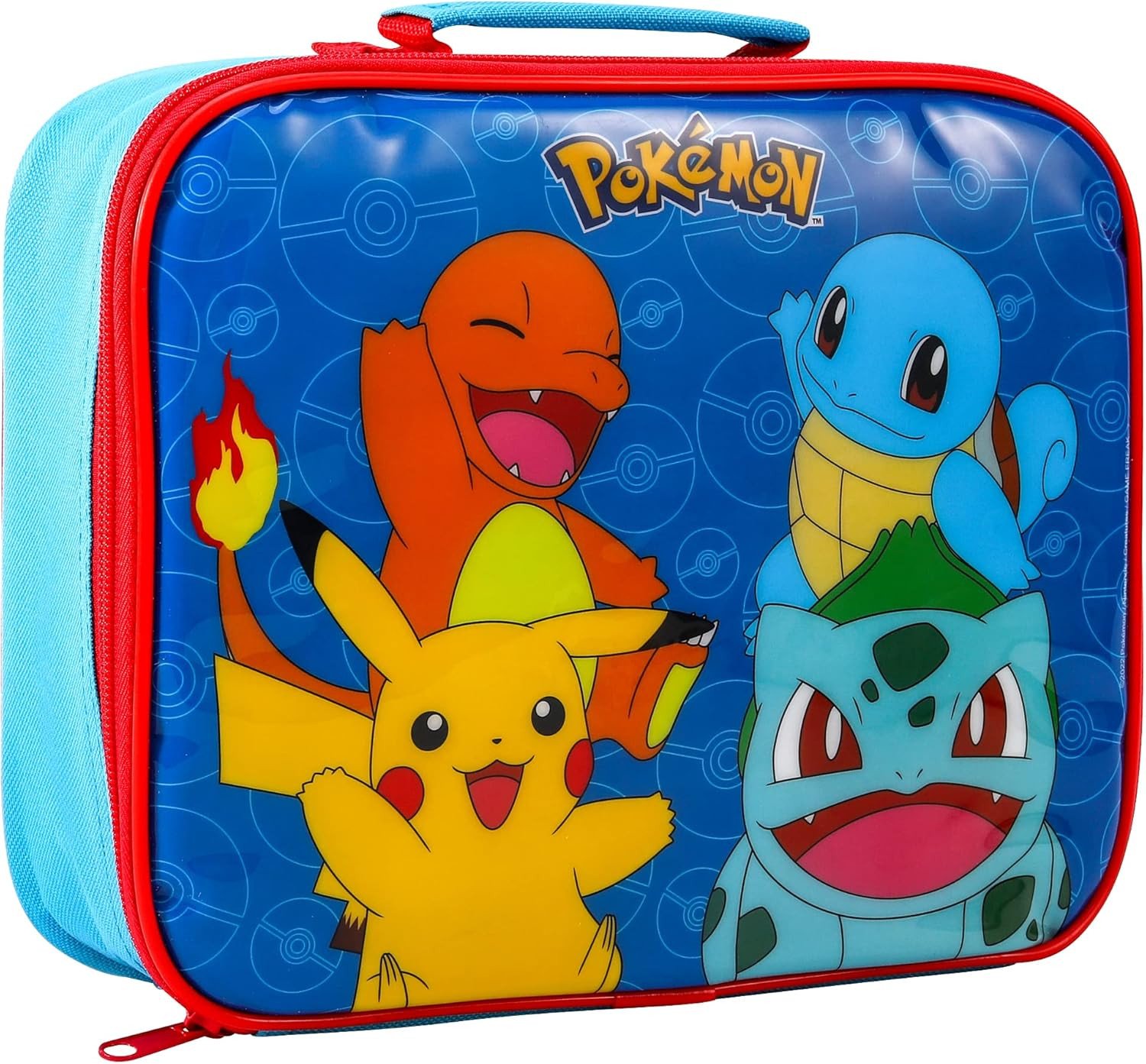 Pokemon Kids Insulated Lunch Bag with Handle – Pikachu, Charmander, Squirtle, Bulbasaur & Eevee – Red School Lunch Box, BPA Free PEVA Lining, 23cm