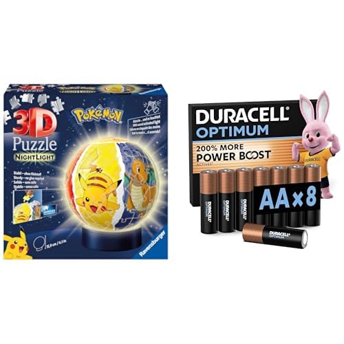 Ravensburger 3D Puzzle Ball Pokemon LED, 72 pieces, 6+ years, & Duracell Optimum AA 8 pack, Power Boost