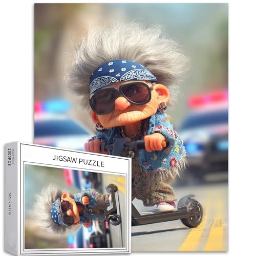 Grandma Riding an Electric Bike 1000 Piece Jigsaw Puzzles for Adults Police Car Chase Scene Art Jigsaw Challenging Family Activity Games Colorful DIY Craft Puzzle for Home Decor Gifts 20×27 Inches