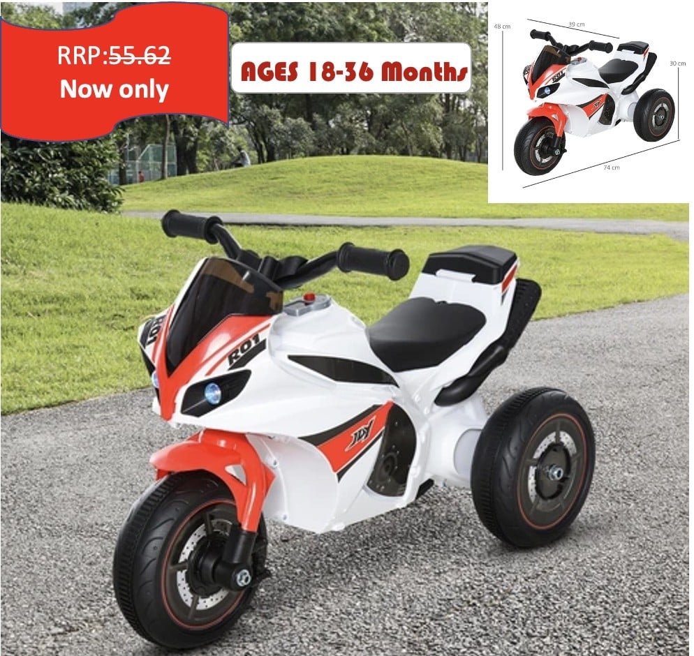 Kids Ride-On Police Bike White Plastic 48x74x39cm 3-Wheel Music Lights 18-36mths