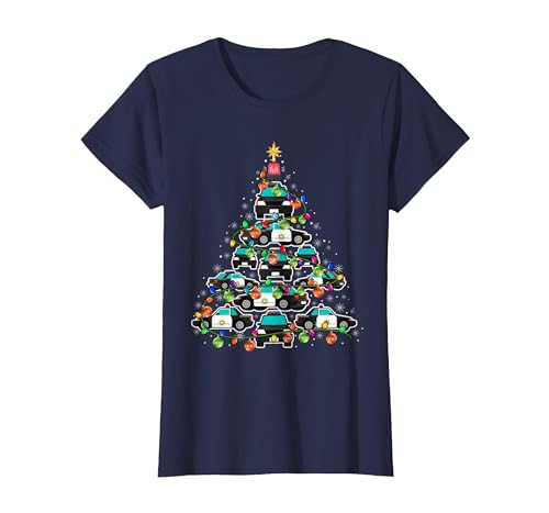 Xmas Tree Police Car Xmas Lights Santa Police Car Driver T-Shirt, Women, Navy Blue, Medium