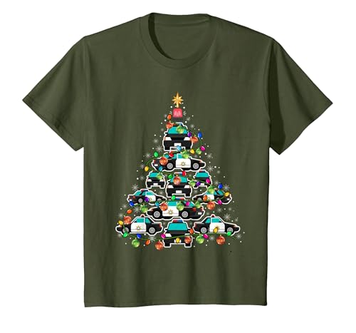 Xmas Tree Police Car Xmas Lights Santa Police Car Driver T-Shirt, Youth, Olive Green, Small