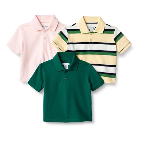 Amazon Essentials Boys' Cotton Spandex Pique Polo Shirt, Pack of 3, Dark Green/Pale Pink/Block Stripe, 6-7 Years