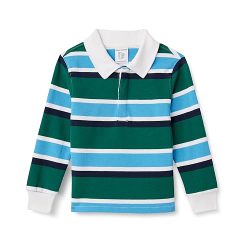 Amazon Essentials Boys' Rugby Polo Shirt, Dark Emerald Green Blue Block Stripe, 6-7 Years