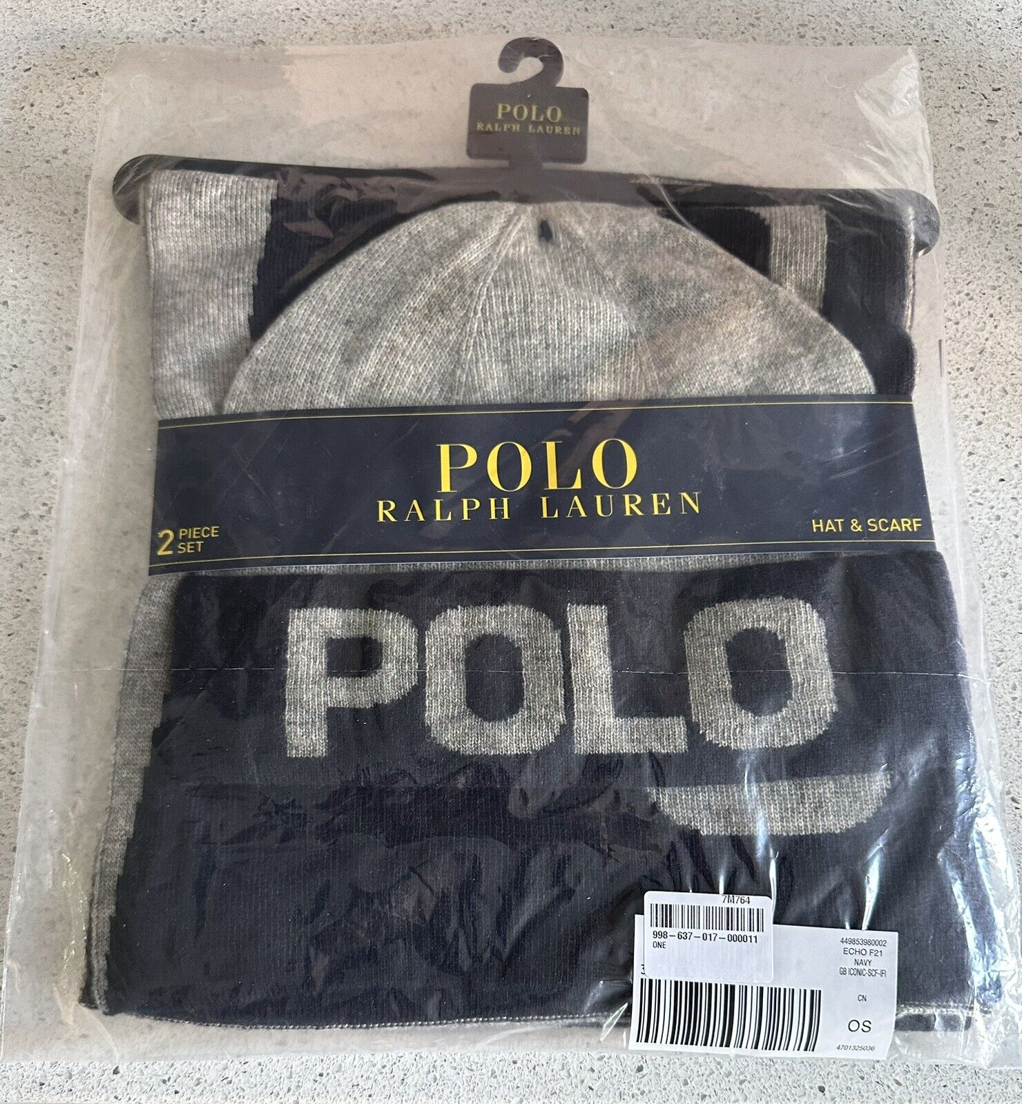 Polo Ralph Lauren Wool Blend Navy Grey Scarf Beanie Hat Gift Set AUTHENTIC BNWT