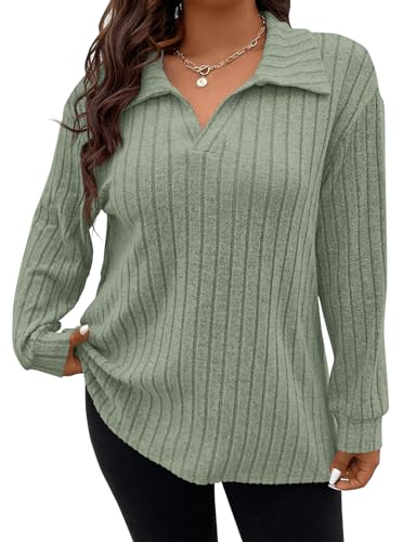 Gemulate Plus Size Long Sleeve Tops for Women Ladies Lightweight Striped Oversized Clothes Sweater Polo v Neck Tshirts Sweatshirts Light Green 3XL
