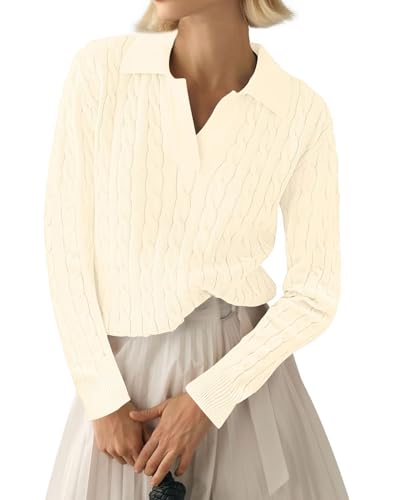 LACOZY Women's 2025 Fall Long Sleeve Sweater V-Neck Collar Pullover Sweater Tops Lightweight Knit Polo Shirt 2025 Apricot S