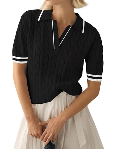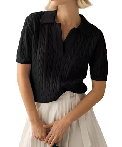 LACOZY Womens Short Sleeve Sweater Tops Lapel V Neck Polo Shirts 2025 Summer Cable Knit Blouses Business Casual Outfits Black 2XL