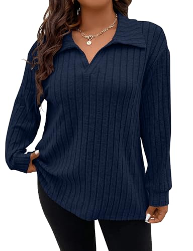 Gemulate Plus Size Ladies Lightweight Jumpers Striped Long Sleeve Tops for Women Oversized Sweater Polo v Neck Tshirts Sweatshirts Dark Blue XXL