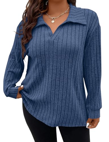 Gemulate Plus Size Long Sleeve Tops for Women Ladies Lightweight Striped Oversized Clothes Sweater Polo v Neck Tshirts Sweatshirts Royal Blue 3XL