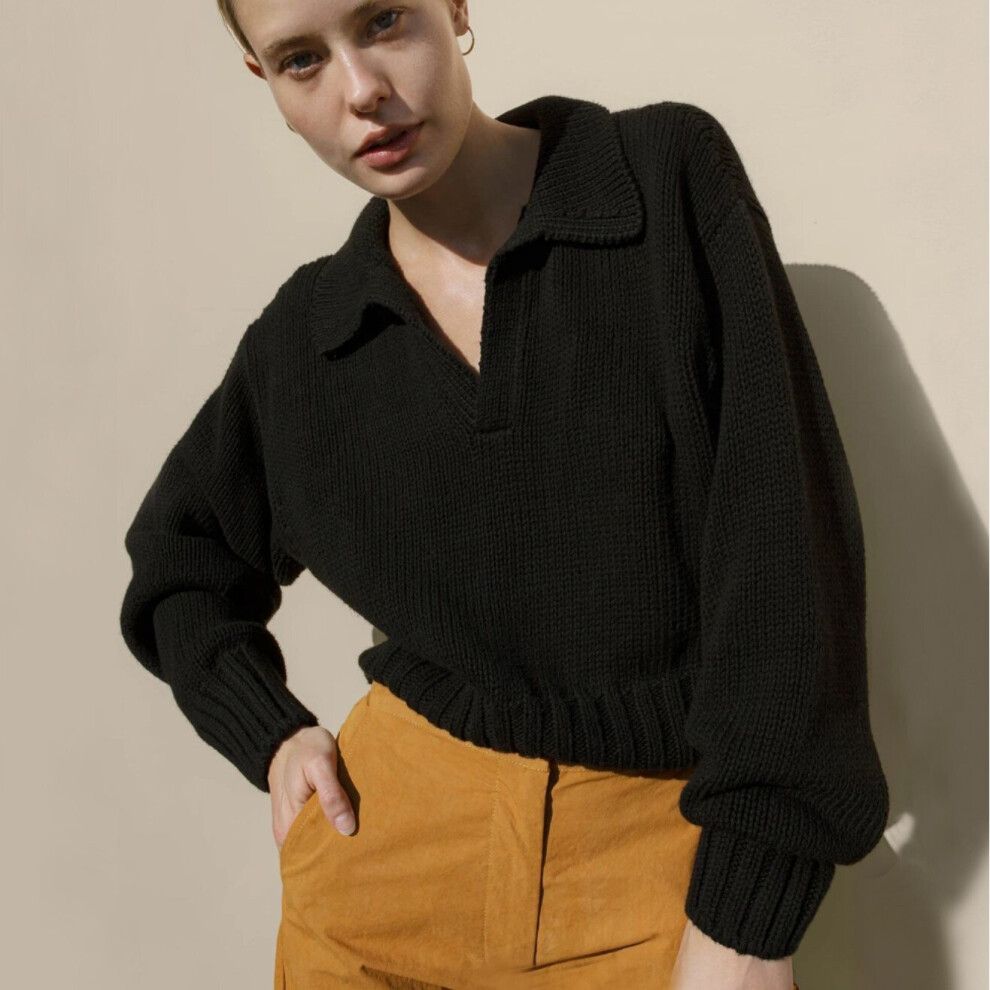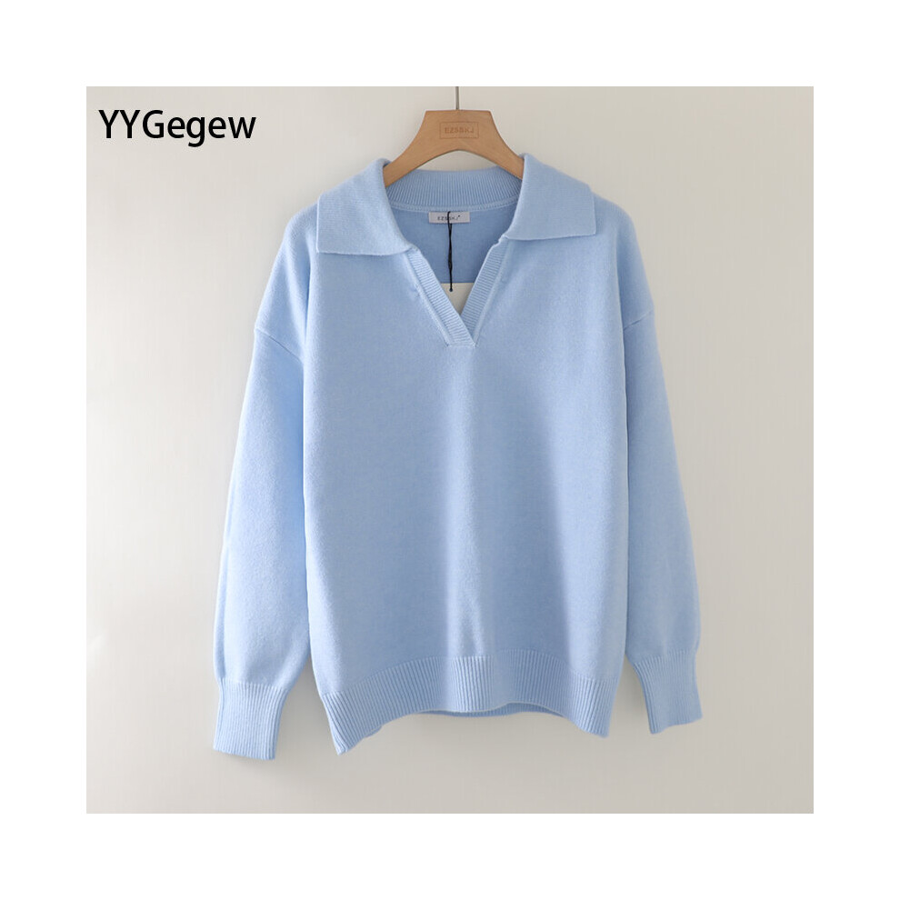 Women Polo Sweater Casual Solid V-neck Top Sweater Autumn Loose Lapel Pullovers Short Top