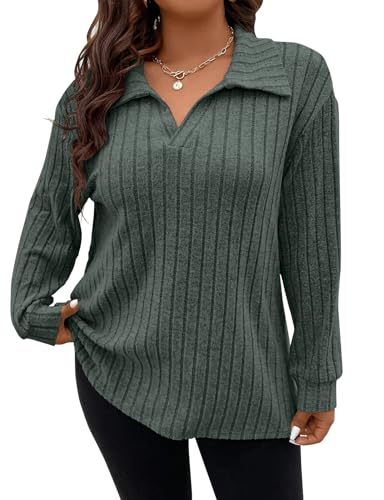 Gemulate Plus Size Long Sleeve Tops for Women Ladies Lightweight Striped Oversized Clothes Sweater Polo v Neck Tshirts Sweatshirts Light Green 4XL