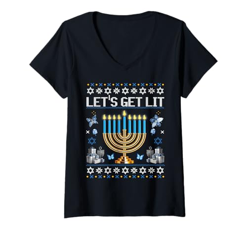 Womens Lets Get Lit Ugly Sweater Hanukkah Chanukah Jewish Menorah V-Neck T-Shirt