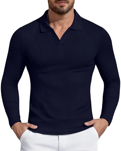 AIYINO Muscle Fit Polo Shirts Mens V Neck T Shirt Winter Shirts Long Sleeve Solid Polo Shirts for Men UK Ribbed Golf Shirts Sweater Navy S