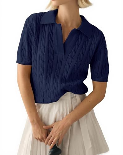 LACOZY Short Sleeve Sweater for Women Lapel V Neck Shirts for Women Spring Summer Polo Casual Blouses Blue