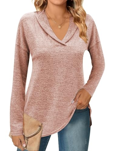 Famulily Comfy Shawl Neck Polo Shirts Sweatshirt for Women V Neck Soft Long Sleeve Jumper Sweater Tops (L, Pink)