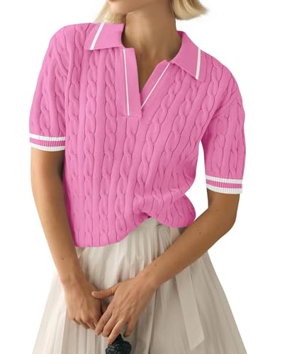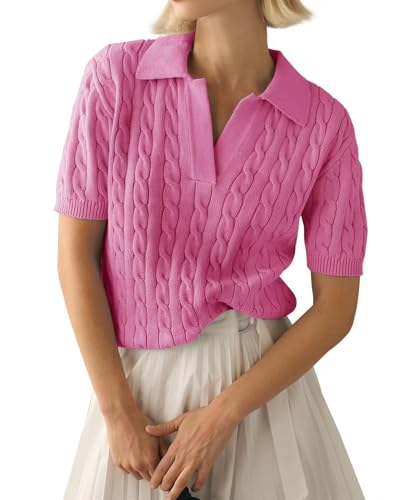 LACOZY Women's Short Sleeve Polo V Neck Sweater Knit Tops Casual Ribbed Shirt Loose Pullover Sweater Pink M