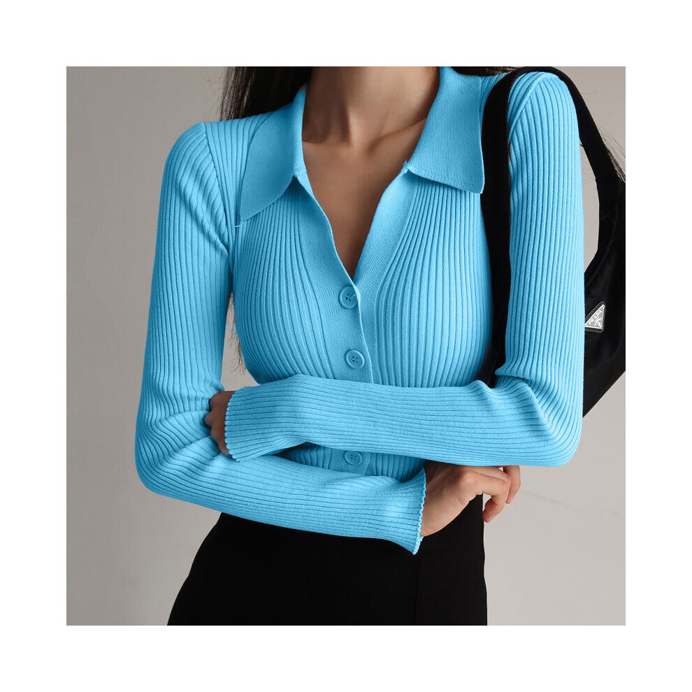 Women Lapel Slim Slimming Tops Ladies Hollow Buttons Sexy V Neck Long Sleeve POLO Neck Knit Cardigan Sweater Women