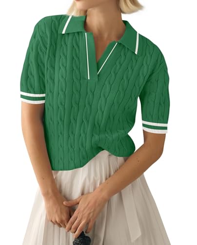 LACOZY Short Sleeve Sweater for Women Lapel V Neck Shirts Basic Polo Business Casual Outfits Spring Summer Green 2XL