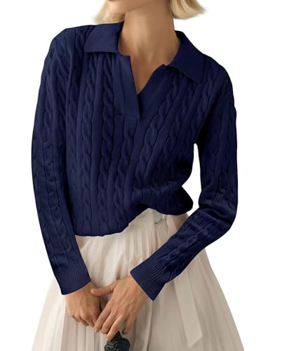LACOZY Women Long Sleeve Cable Knit Sweater Polo Collar Shirt V Neck Business Casual Fashion Fall Pullover Tops Blue XL
